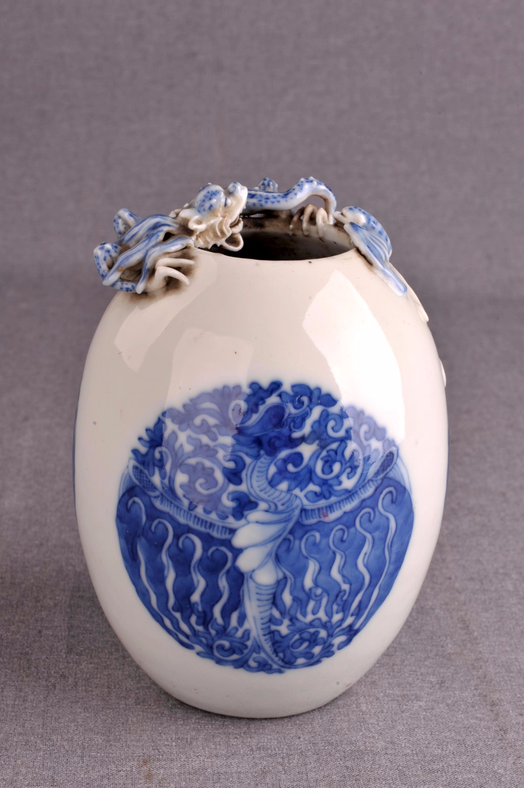 青花龙凤纹罐,高20厘米,口径6厘米,底径6.5厘米。橄榄形,口内收,口沿堆贴一蟠螭,一蝙蝠,均用淡色青花点染。蝙蝠头伸悬于罐口边沿,罐身有青花团形变...