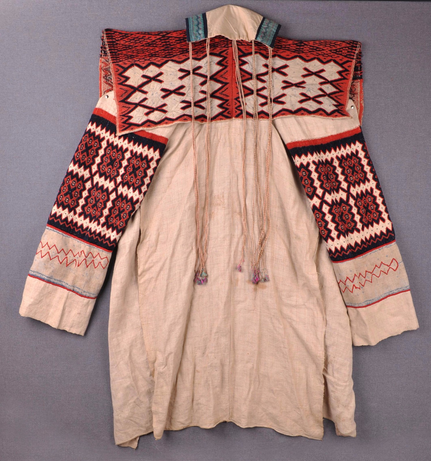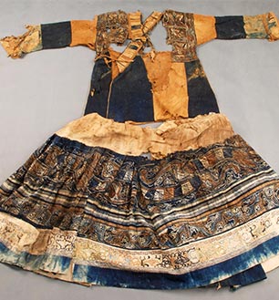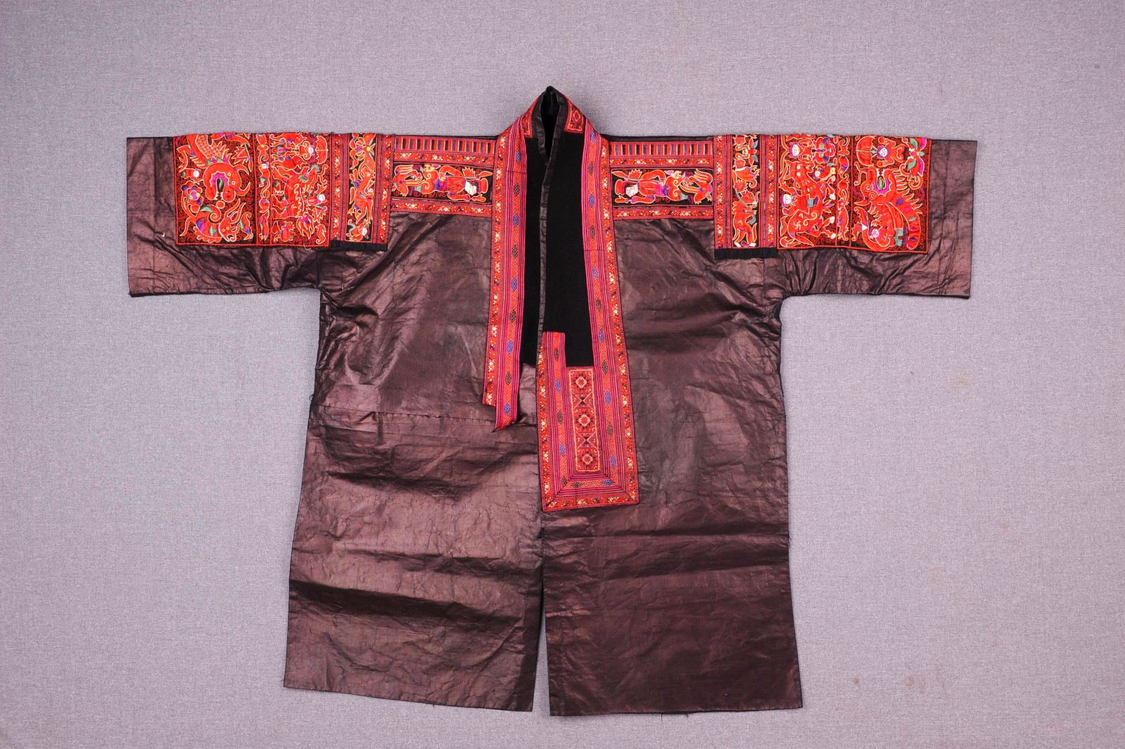 这件衣服是施秉县苗族妇女的节日盛装,以斗纹布为底料,破线平绣而成,衣长60CM,制作年代为1913年。领襟除用彩绫堆花外,还镶有一道彩纹花边,颇为难得...
