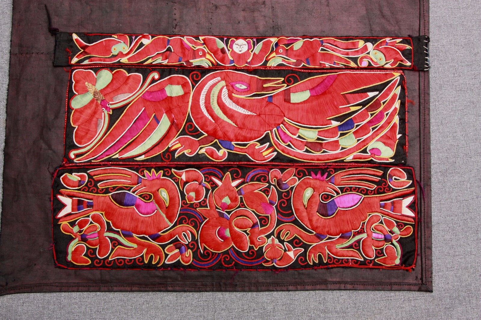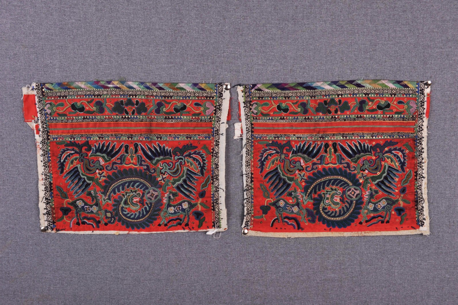 查看更多内容台江苗族女衣的刺绣尤其以双袖上的一对刺绣最有代表性。该袖片一对两块,征集于台江县,辫绣工艺制作。辫绣早在3000多年前已经出现。该袖片以红色绸缎为底,...