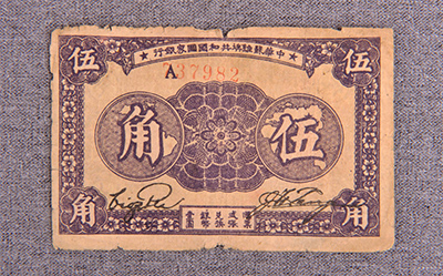 查看更多内容红军纸币,正面上方“中华苏维埃共和国国家银行”12个字,左右各印五星,中间及四角由对称花饰组成,背面以花饰为主。票幅6.7厘米×10.3厘米,正面呈浅紫色,背面呈浅红色。年款:1933。面值为“伍角”。