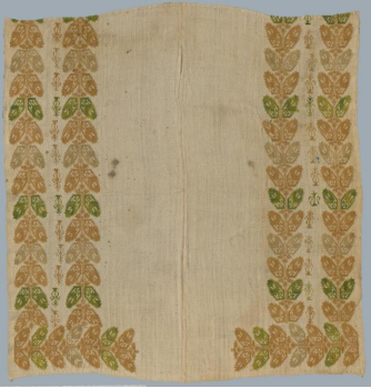 这件希腊的阔叶纹刺绣(见图4),纹样为同一叶纹沿布边缘两侧有序排列成对称L型,叶纹色彩有序变化,重复出现,好似橄榄枝叶,橄榄树象征着胜利,代表了希望。