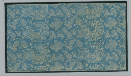 意大利是古代丝绸之路的终点,也是海上丝绸之路的交汇点。这件来自十八世纪的卷状花纹织锦(见图5),面料运用蓝白两色纬线,纹样为不对称的卷状花回图案,十分巧妙。