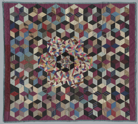 拼布是指用缝纫的形式将织物碎布拼在一起,组成一个较大尺寸的织物。用拼布技艺做被子最早出现在11-13世纪,后来这种传统被新教徒带到美国。此件拼布(见图8)大量使用了平素、提花、印花面料和绒织物,整体色彩沉稳大方,多而不乱。