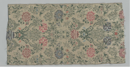 18世纪30年代,法国丝绸纹样设计出现转折点,纹样趋于写实,颜色趋于柔和。此件法国米色地花卉纹妆花织锦(见图6)的图案为巴洛克风格,花卉纹样趋于写实,同一朵花卉使用同一色彩的渐变色,使图案产生立体化效果。
