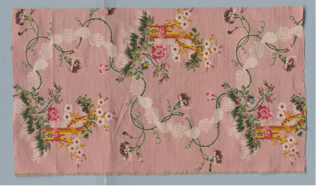 英国丝绸设计在18世纪40-50年代也出现了在平纹或菱纹地部上织满花卉图案的特点,相较法国的设计更趋向自然主义的发展。这一件粉地独幅花卉建筑纹挖花织物(见图7)由白色羽毛在织物形成一条S型的线条,石筑拱门和篱笆上缀满了红花绿叶,一派热闹景象。