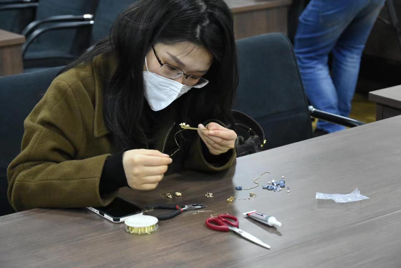 4月17日13:30,社教老师们开始分发制作发簪的材料。发簪零件、慢干胶、珠宝钳、铜丝被整齐地摆放在桌上,等待着开启它们的人。14:30活动正式开始,首先,社教老师讲述发簪相关文化知识、展陈文物杨氏土司墓群出土的金银器物及金凤冠;接下来“敲敲打打”开始组装起桌上零散的部件了。渐渐地,一支支粉色、金色、蓝色、绿色的发簪呈现在眼前。