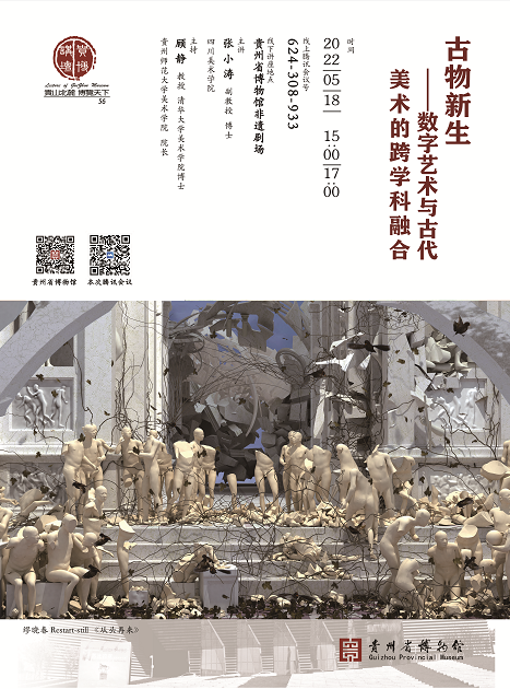 主题:古物新生——数字艺术与古代美术的跨学科融合 时间:2022年5月18日(星期三)15:00-17:00 线上腾讯会议号:624-308-933 线下讲座地点:贵州省博物馆非遗剧场 主讲:四川美术学院 张小涛 副教授 博士 主持:贵州师范大学美术学院院长 顾静 教授 清华大学美术学院博士