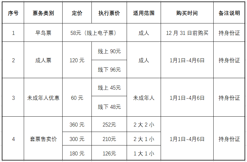 儿 童:6 周岁(含)以下或身高 1.4 米(含)以下,在成人陪同下凭身份证或户口本享受免费。1名成人限带1名免票儿童,额外超出儿童需购买半价票。