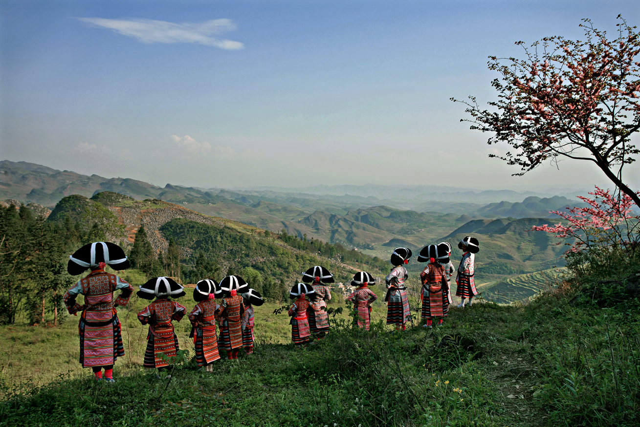 跳花一般要到午后才开始,先是三三两两盛装打扮的少男少女们不约而同的聚集在场坝上,不一会儿,每座山头都占满了前来参加盛会的人们。2005年摄